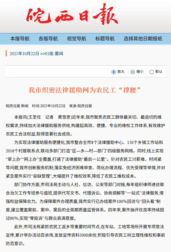 皖西日报:我市织密法律援助网为农民工“撑腰”