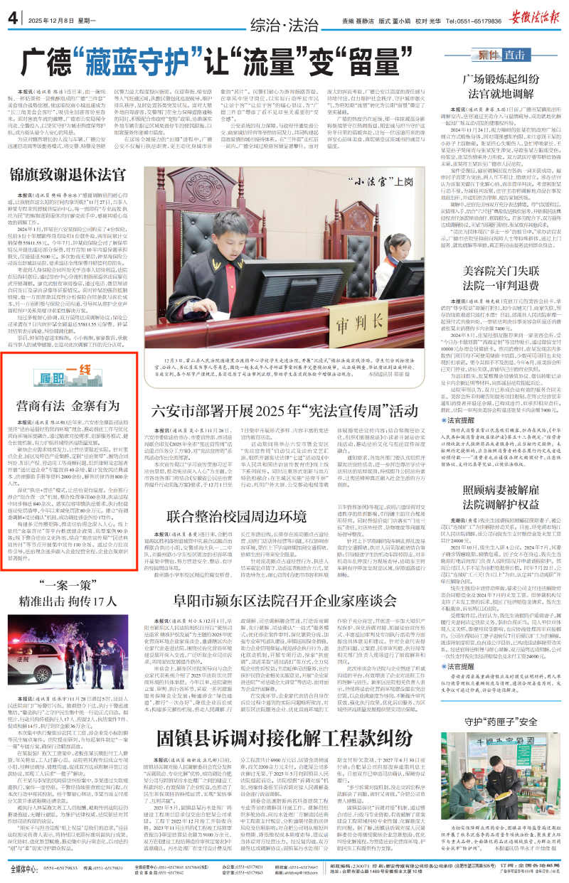 构建多元传播矩阵,推动法治理念深入人心。线上依托“金寨普法”等平台推送惠企政策、典型案例90余条;线下整合法治文化阵地,结合“宪法宣传周”“民法典宣传月”等节点开展集中宣传110余场。通过全方位宣传引导,法治理念逐步融入企业经营全程,企业合规意识显著提升。