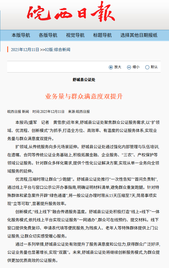 皖西日报:舒城县公证处业务量与群众满意度双提升