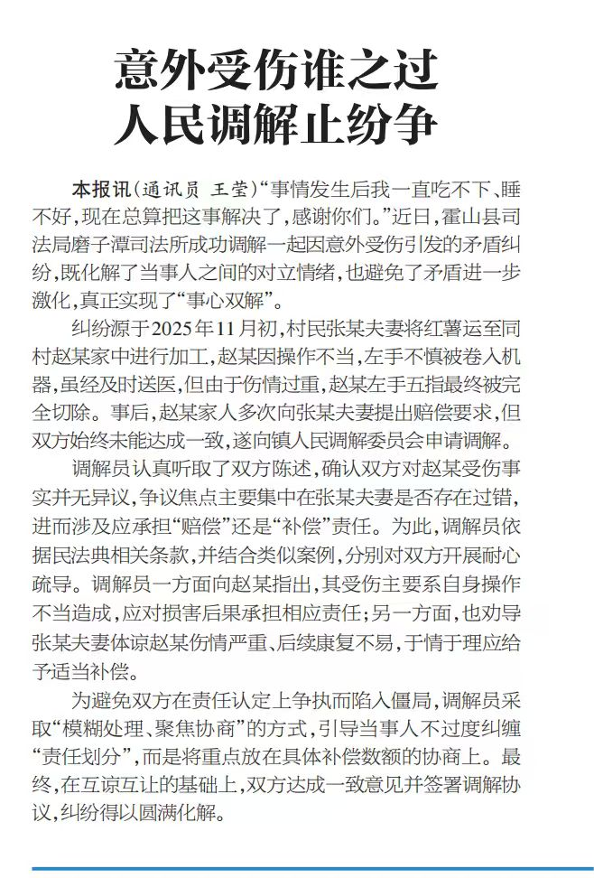 安徽法治报:意外受伤谁之过 人民调解止纷争