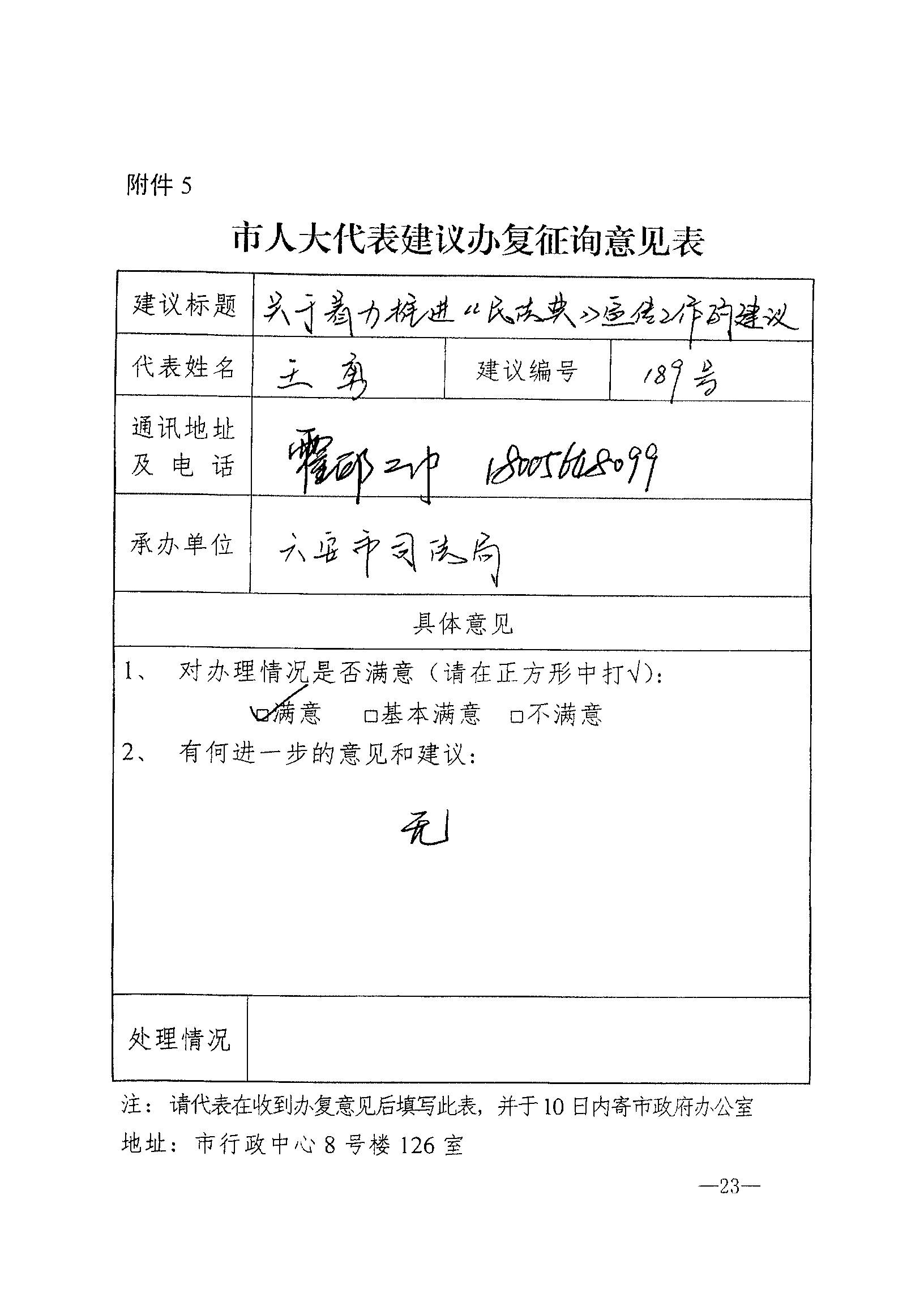 关于六安市第五届人民代表大会第四次会议第189号建议的办复征询意见表