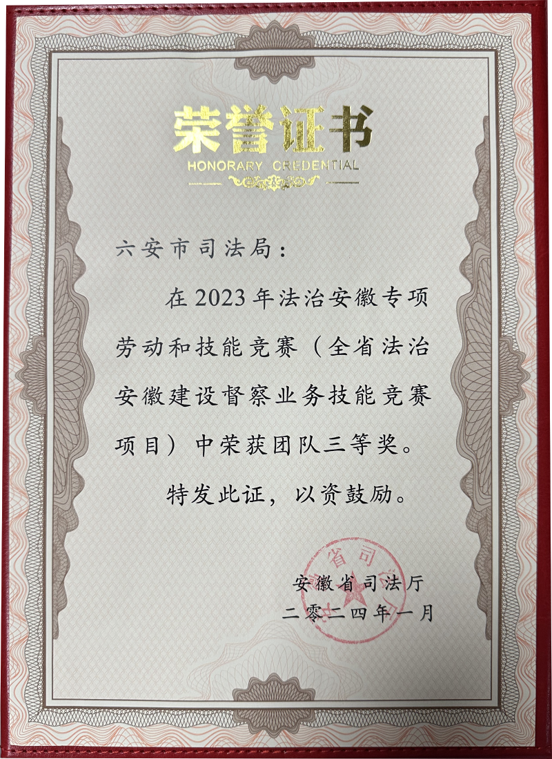 2023年法治安徽专项劳动和技能竞赛(全省法治安徽建设督察业务技能竞赛项目)团队三等奖