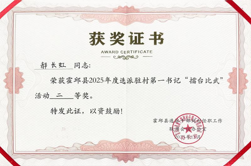 霍邱县2025年度选派驻村第一书记“擂台比武”活动二等奖(郝长虹)