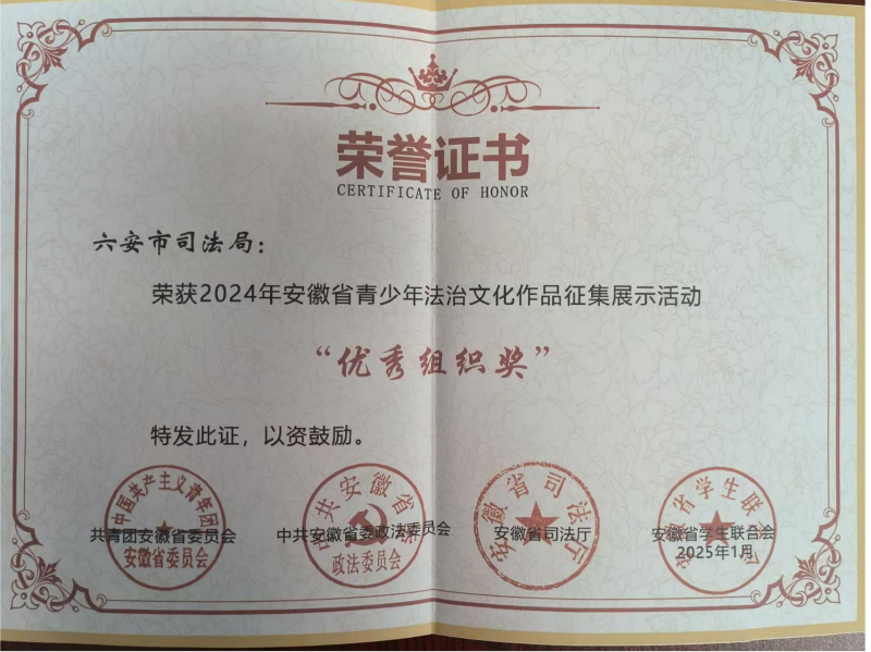 2024年安徽省青少年法治文化作品征集展示活动优秀组织奖